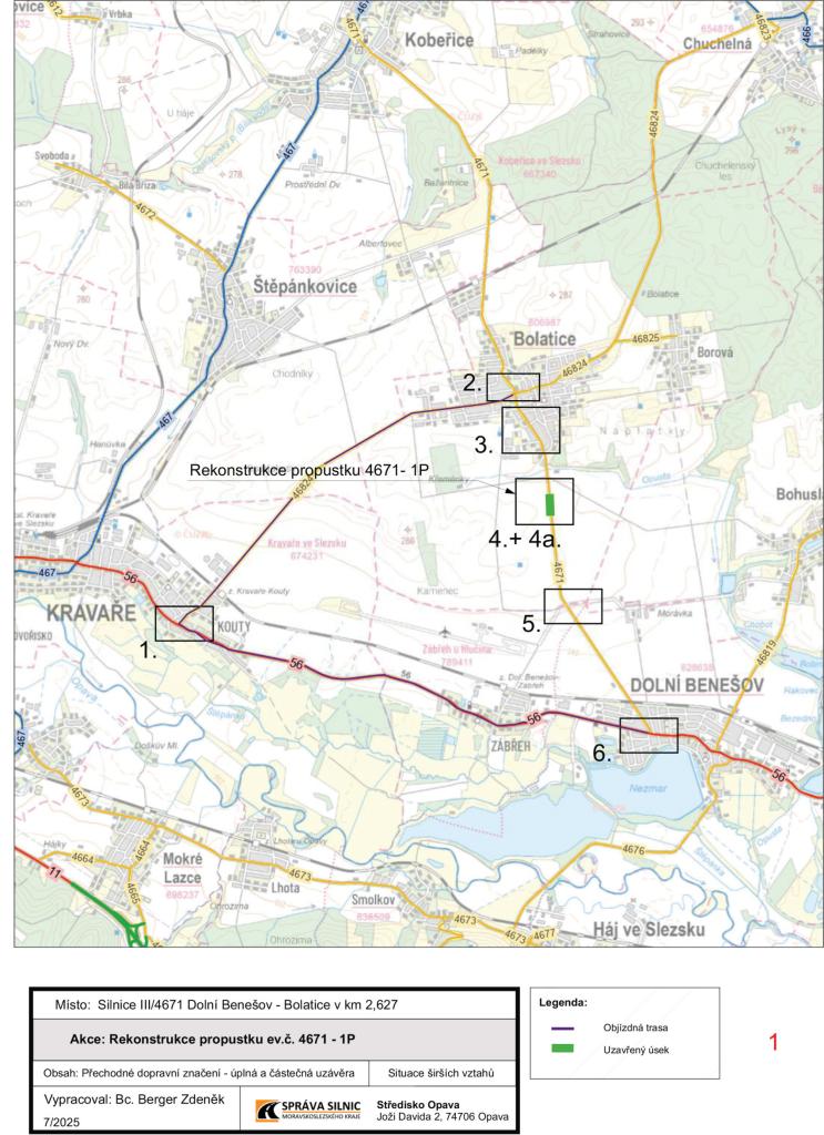 uzavírka silnice č. III/4671 Dolní Benešov – Bolatice v km 2,627 z důvodu provádění stavby „Rekonstrukce propustku ev. č. 4671 – 1P km 2,627 v úseku Dolní Benešov-Bolatice“.